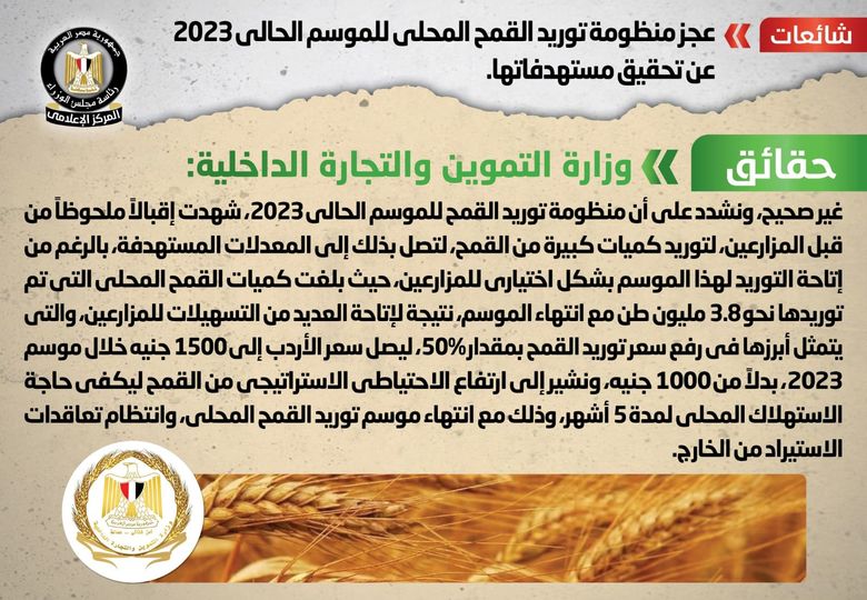 نفي المركز الإعلامي لمجلس الوزراء بالتواصل مع وزارة التموين والتجارة الداخلية، ما نُشر في بعض المواقع الإلكترونية وصفحات التواصل الاجتماعي أنباء بشأن عجز منظومة توريد القمح المحلي للموسم الحالي 2023 عن تحقيق مستهدفاتها.