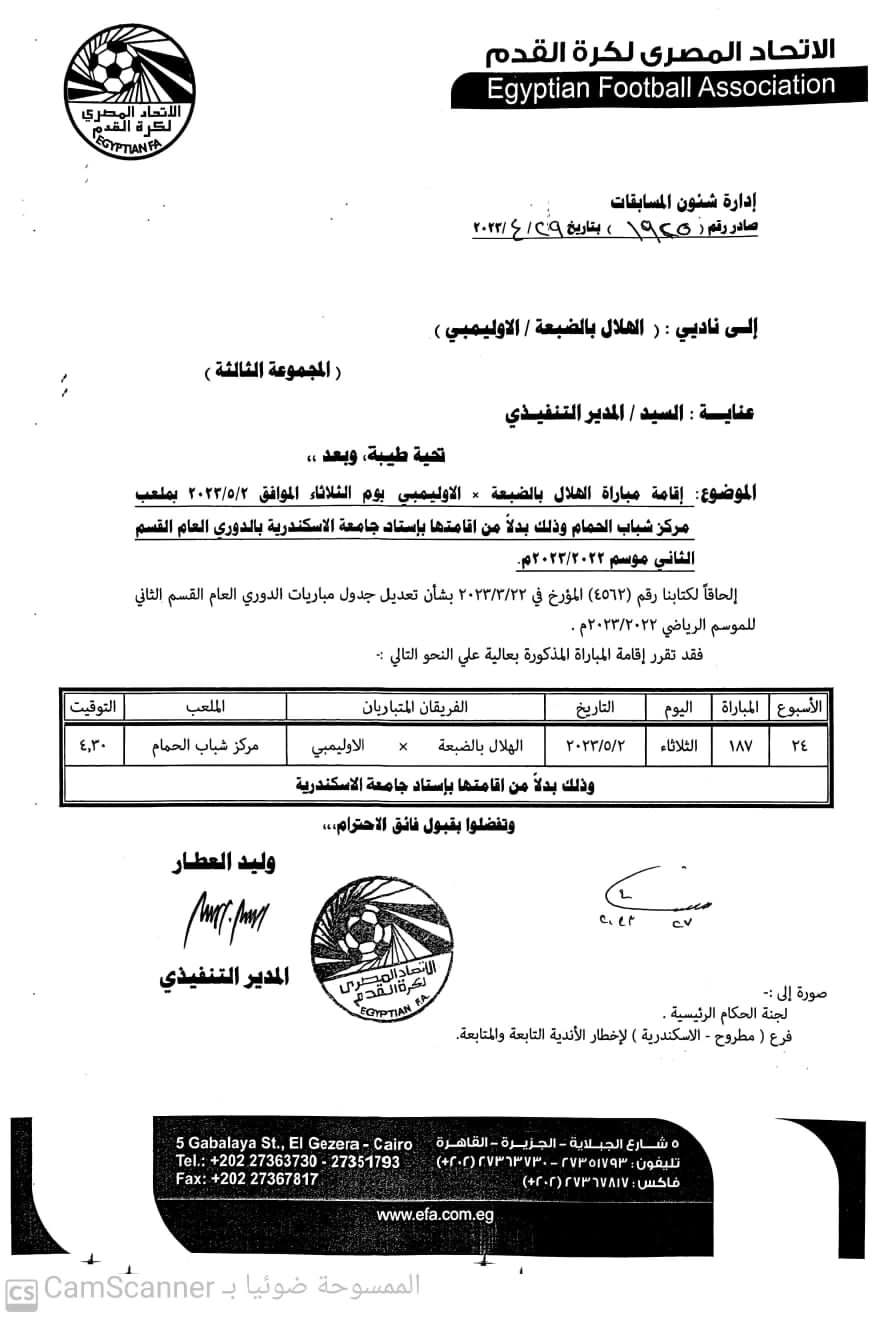 وحصل موقع الأول نيوز علي صورة من خطاب لجنة المسابقات بشأن تغيير ملعب مباراة هلال الضبعة الأوليمبي.