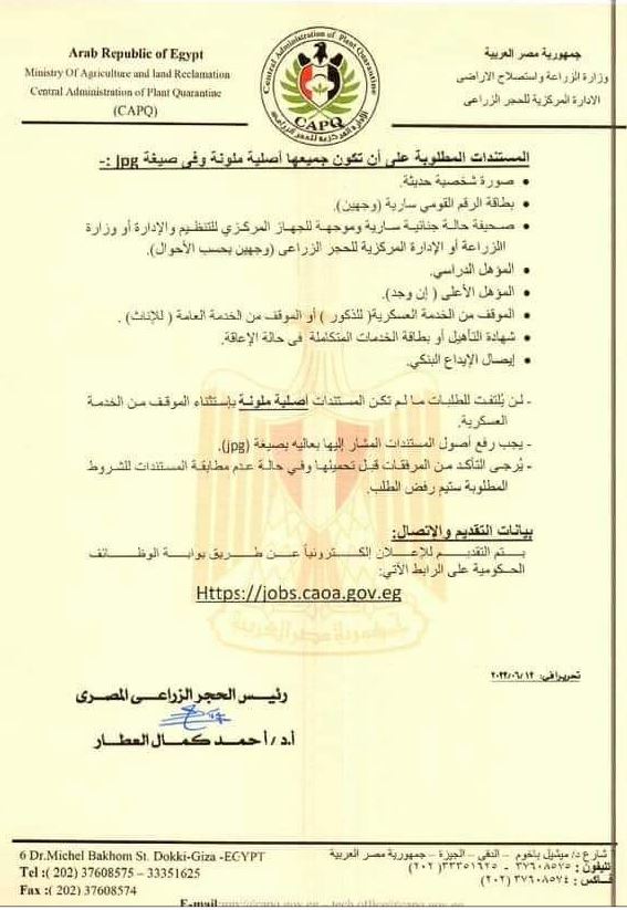 كما تم الإعلان عن الحاجة إلى التعاقد مع عدد 5 أشخاص في وظيفة محاسب بالإدارة المركزية للحجر الزراعي التابعة لوزارة الزراعة واستصلاح الأراضي وذلك بالمقرات والمعامل المركزية التابعة للحجر الزراعي بالمواني والمحافظات التالية (السويس، الاسكندرية، القاهرة، دمياط، البحر الاحمر )