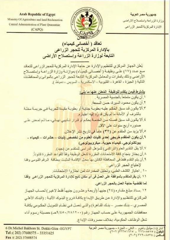 كما تضم الإعلان التعاقد مع عدد 17 شخصا في وظيفة اختصاصي كيمياء بالإدارة المركزية للحجر الزراعي التابعة لوزارة الزراعة واستصلاح الأراضي وذلك بالمقرات والمعامل المركزية التابعة للحجر الزراعي بالمواني والمحافظات التالية ( الجيزة، القاهرة، القليوبية، الإسكندرية، السويس، دمياط ).